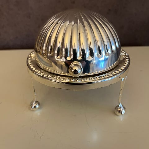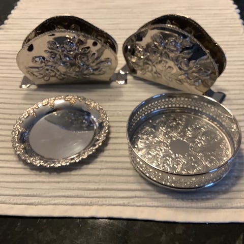 Antikk serviettholder og tilhørende tesil i nysølv.