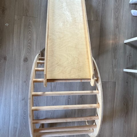 Flott klatrestativ med sklie/klatrevegg selges. Pent brukt. Sammenleggbar konstruksjon for å spare plass når den ikke er i bruk.