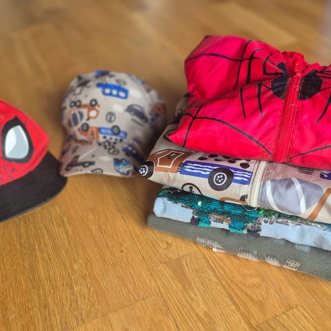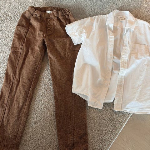 I eska er det svarte jeans, varme bukser, ei beige skjorte (blir eit veldig fint sett saman med dei svarte jeansa), ei vest og ein genser med dinosaur og glidelås.