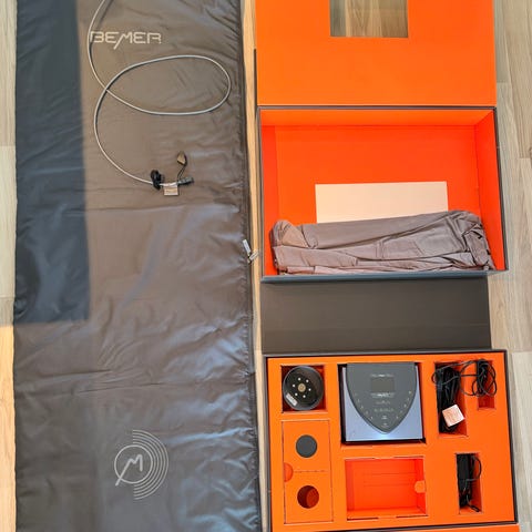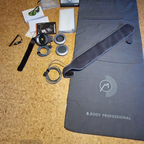 Bemer Pro magnetfeltterapi system med kontrollenhet, behandlingsmatte og flere applikatorer.