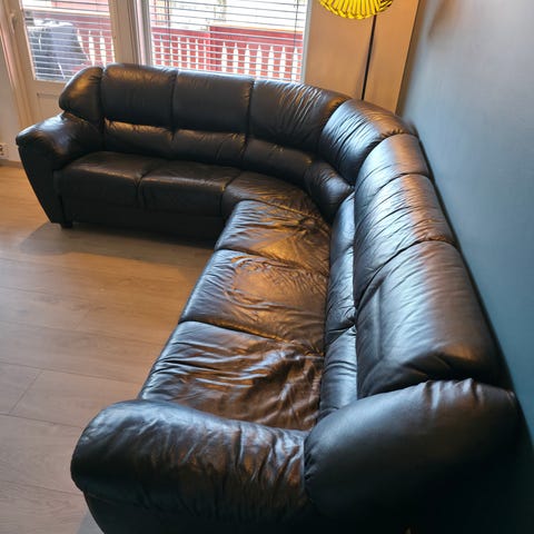 En godt brukt hjørnesofa i skinn, gis bort. Sofaen har sett sine beste dager, men har fremdeles litt bruk igjen. Kanskje dere trenger sitteplass i en kjellerstue eller lignende? Må hentes rundt 06.04.26