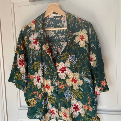 Desigual skjorte for dame i størrelse XL. Skjorten er flerfarget med ulike blomster- og naturinspirerte mønstre i blant annet grønne, rosa og turkise toner. Kortermet modell med krage og knappelukking foran. Materiale i viskose som gir et lett og mykt stoff. Passer som en løs, mønstret overdel til hverdagsbruk eller fritid.