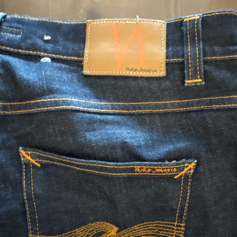 Nudie Jeans jeans i blå denim for herre. Buksen har livvidde W32 og er i størrelse L. Klassisk 5-lommers modell med knapp og glidelås i gylfen, kontrastsømmer og karakteristisk broderi på baklommen. Materiale i denim (bomullsjeans). Passer som hverdagsbukse eller til mer uformelle anledninger.