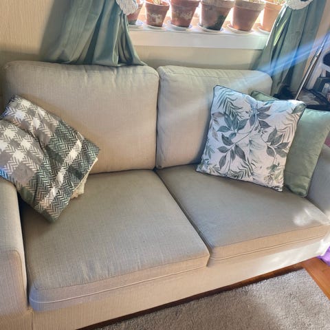 Toseter sofa og puff gis bort. Ikke slitt og meget god å sitte i. Puffen er i samme design og produsent. Puffens mål er 71 cm x 65 cm Må hentes!