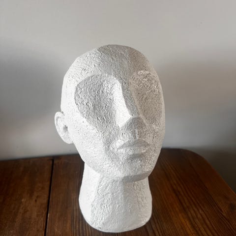 Dekorativ skulptur formet som et stilisert ansikt. Skulpturen er ca. 33 cm høy og har en grov, strukturert overflate i hvit farge. Passer som innredningsdetalj på hylle, skjenk eller bord i stue, gang eller kontor. Materialet fremstår som et hardt, steinlignende komposittmateriale egnet for innendørs bruk.