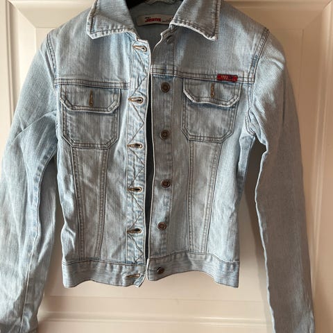 Kangol dongerijakke for dame i størrelse S. Jakken er i blå denim med klassisk jeansjakke-design, krage og knappelukking foran. Modellen har lommer foran og synlige sømmer som typisk for denimjakker. Passer som ytterlag i mildt vær eller som lag-på-lag-plagg over topper og gensere.