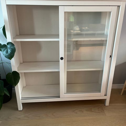 Pent brukt kommode/vitrineskap. Den har 3 seksjoner, glassplater mellom de to øverste seksjonene. Vanlig plate på den nederste hvor det ikke er glass på døren.