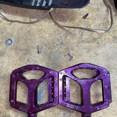 Selger et sett med mountainbike pedaler med matchene flaskeholder i chrome/flerfarget
