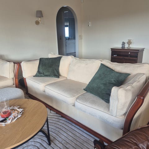 Dette er en god sofa å sitte i, trekkene kan tas av og vaskes, men denne trenger å trekkes om. Må hentes.