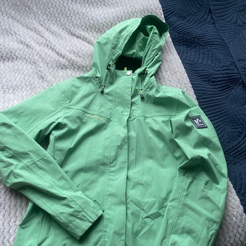 Twentyfour regnponcho for dame i størrelse 36. Jakken har en nydelig isblå farge, og er laget i polyester. Den har hette, glidelås i front og to sidelommer. Elastikk ved håndledd gir bedre passform. Passer som ytterjakke i regnvær og fuktige forhold. Brukt en gang- viste seg å være feil størrelse for meg, dessverre.