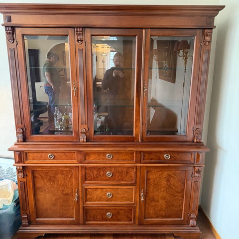 Vitrineskap i tre med glassdører øverst og skapdører nederst. Øvre del har sprosseinndelte glassdører og hyller til oppbevaring og utstilling av servise, glass eller pyntegjenstander. Nedre del har to skuffer og to skapdører med ekstra lagringsplass. Passer som hjørneskap i stue, spisestue eller kjøkken for organisert oppbevaring og oversiktlig visning av innhold.