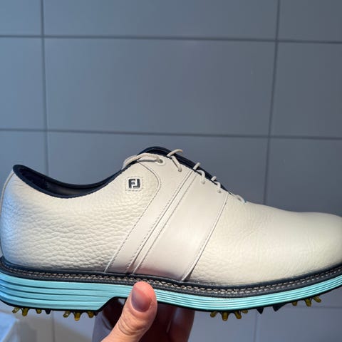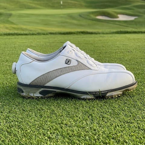 FootJoy golfsko i størrelse 38. Skoene har overdel i hvit og grå farge med snøresystem som strammes med dreiehjul på hælen. Yttersålen har pigger som gir godt grep på gress.