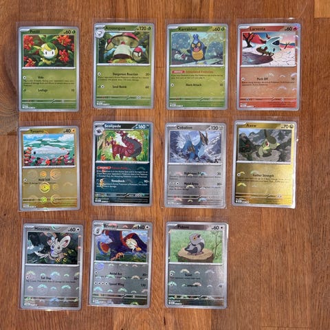 Selger mange Pokémon-kort. Ta gjerne en titt på hva annet jeg har! Alle kortene er i sleeves og sendes med toploaderere. Tilstanden er NM, med mindre annet er spesifisert. Jeg har også bulk fra Scarlet and Violet era, Mega Evo Base og Phasmo Fhantasmal Flames. Hvis du mangler noe, send meg en DM med en liste.