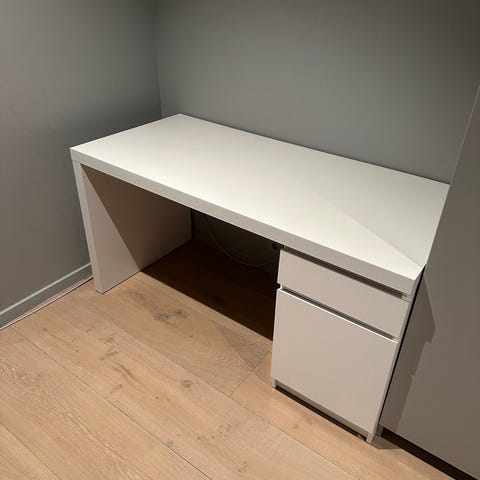 IKEA skrivebord. Skrivebordet har en bordplate støttet av en oppbevaringsdel med åpne hyller på den ene siden og ben på den andre. Det ble kappet av noen cm av bena for å utjevne skjevt gulv. Trenger altså nye ben.