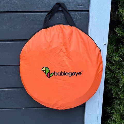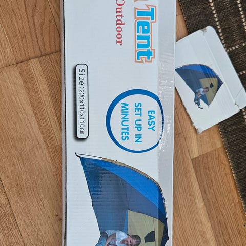 Uvteltet er Ubrukt. Popp opp telt. Fint å bruke på stranden hvor man har god plass til å boltre seg.