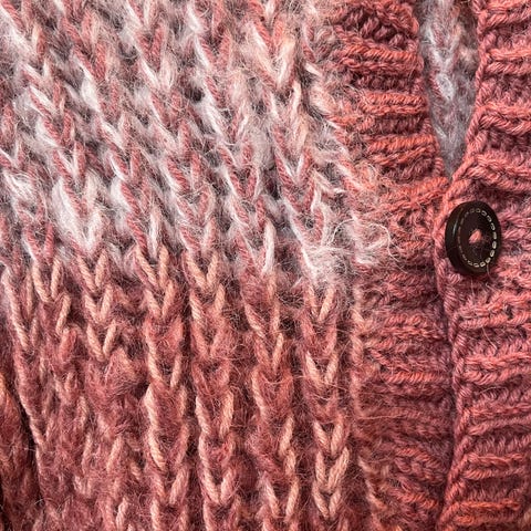 A15. str. 104 ULLjakke m/litt høy hals, knapper og strikkmønster (rød) Hjemmestrikket. Som ny. 150kr