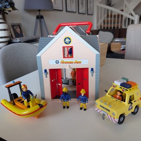 Selger brannmann Sam sett. Det er et lekehus (mangler dør), en brannbil, noe utstyr til huset og 7 stk figurer.