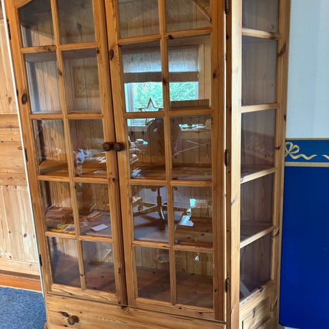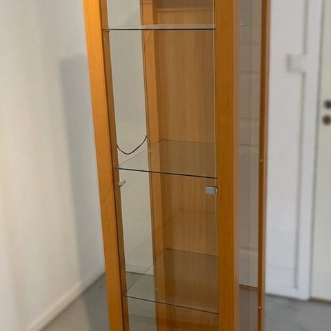 Vetrineskap med dører. Høyde 182 cm, bredde 115 cm og dybde 35 cm.