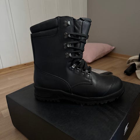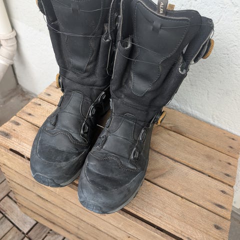 Alfa støvler i størrelse 45. Modellen er i svart farge med høyt skaft og kraftig snøring. Overdelen er i slitesterkt materiale, og sålen har grovt mønster for godt grep på variert underlag. Støvlene egner seg til tur og friluftsbruk der det er behov for stabile og robuste sko.