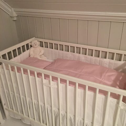 Lys grå seng, den er veldig pen, men har fått et lite merke fra sengehesten