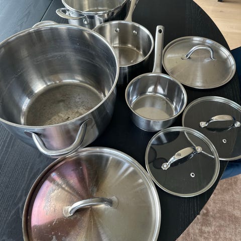 Modern House kokesett med gryter og stekepanner. Sett med minst to gryter med lokk, en stekepanne og Eva Solo gryteunderlag og et sprut lokk