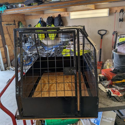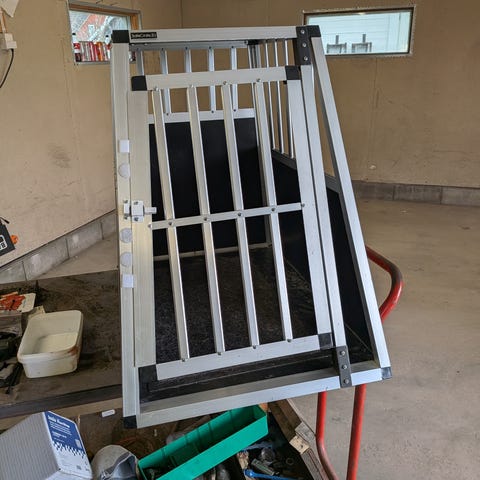 Stort bilbur til hund i aluminium. Merke Instinct. Buret har skrå bak- og frontside som gjør det egnet for plassering i bagasjerom på bil. Størrelse er beregnet til mellomstor til stor hund.