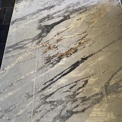 Rusta teppe med påfuglmotiv i kontrastfarger. Teppe med mønster av stiliserte fjær i gylne toner mot lys og nøytral bakgrunn. Passer i stue, spisestue eller andre oppholdsrom. Rektangulær fasong, flatvevd overflate som gjør det enkelt å støvsuge og holde rent. Egnet til bruk under bord og sittegrupper på harde gulv som parkett eller laminat.