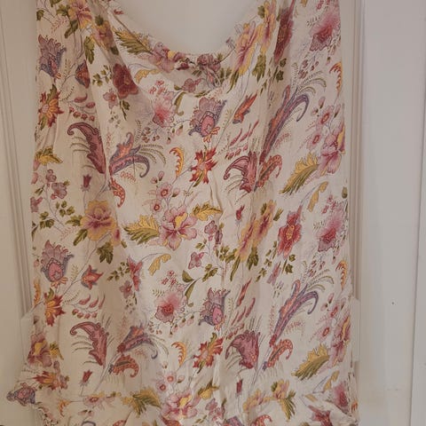 Fint, blomstermønstret skjørt fra KappAhl, str.46, pent brukt. Skjørtet har glidelås og knapp bak. Laget av 100%polyester, underskjørt av 100%viskose. Kan sende🌿