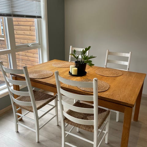I god stand, noen små skrammer og hakk. Benken passer under bordet.