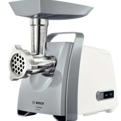 Elektrisk kjøttkvern egnet til maling av kjøtt til for eksempel kjøttdeig, pølsefarse eller andre kjøttblandinger. Modellen har en motor med effekt på 500 W og leveres med påmater og utskiftbare hullskiver for ulike grovheter. Kvernhus, mateskål og tilbehør er av metall og plast, og apparatet står på en base med betjeningsknapper på siden.