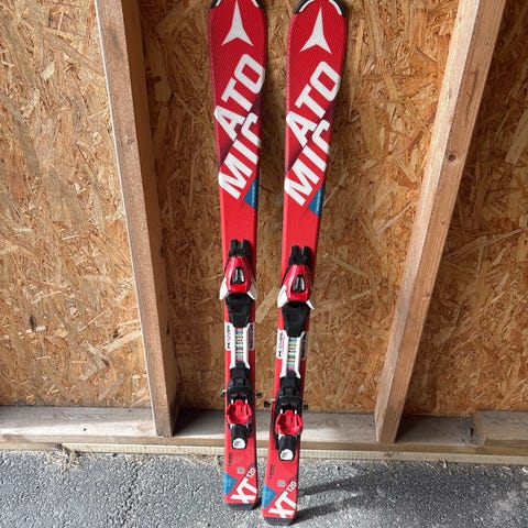 Atomic alpinski med integrerte bindinger i rød og svart farge. Skiene har tradisjonell carvingshape og er egnet til bruk i alpinbakke. Justerbare bindinger.