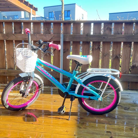 Barnesykkel 16" i turkis og hvit farge. Sykkelen har støttehjul-fester, bagasjebrett bak og kurv foran. Sete og holker er lyse, og felgene har rosa detaljer. Passer til barn mellom 4-6 år.