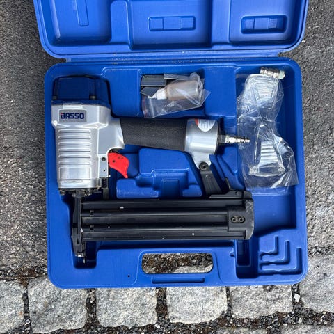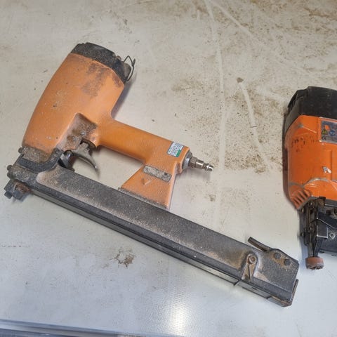 Stivimo spikerpistol i oransje farge. Verktøyet er beregnet for innskyting av spiker i tre- eller andre byggematerialer. Pistolens konstruksjon gjør den egnet for tyngre snekker- og tømrerarbeid der det er behov for rask og jevn innfesting av spiker. Passer for bruk på byggeplass eller i verksted. Nærbilder viser detaljer som patentnummer og magasin, slik at kompatibilitet med spiker og tilbehør kan vurderes ut fra bildene.