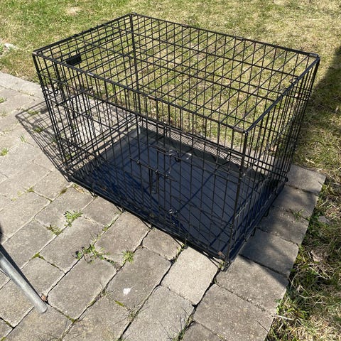 Sammenleggbar hundebur i metall i svart farge. Buret har nettingkonstruksjon med håndtak på toppen for enkel bæring. Bunnen består av et uttakbart brett som gjør rengjøring enklere. Buret kan foldes helt sammen for plassbesparende oppbevaring når det ikke er i bruk. Egnet til transport eller som hvileplass for hund, avhengig av størrelse på dyret og buret.