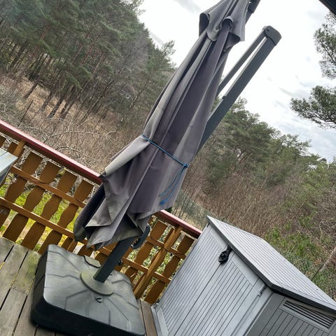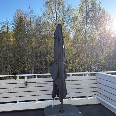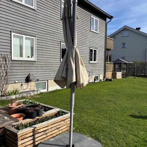 Parasoll i nøytral beige farge med tilhørende parasollfot. Passer til bruk på terrasse, balkong eller i hage for å gi skygge. Parasollen har klassisk rett stang og rund skjerm. Egnet for utendørs bruk i sommerhalvåret.