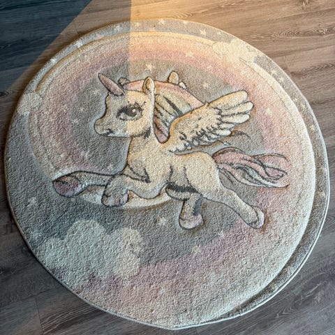 Teppet har et koselig og populært motiv med enhjørning, regnbue og stjerner i rolige pastellfarger. Passer perfekt til både jenterom og lekerom.