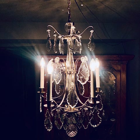 Lysekrone til stearinlys i svart metall med dekorative glassprismer. Modellen har flere armer med holdere for kronelys og hengende prismer i klare og mørkere nyanser. Egnet som taklampe i stue, spisestue eller andre rom der man ønsker levende lys og dekorativ belysning. Monteres i tak med krok eller tilsvarende oppheng etter behov. Kjøpt i København i en antikvitetshandel.