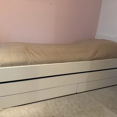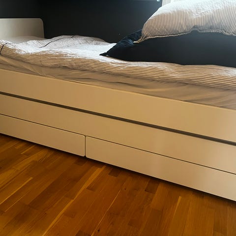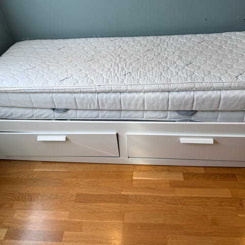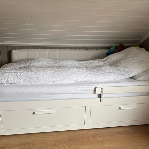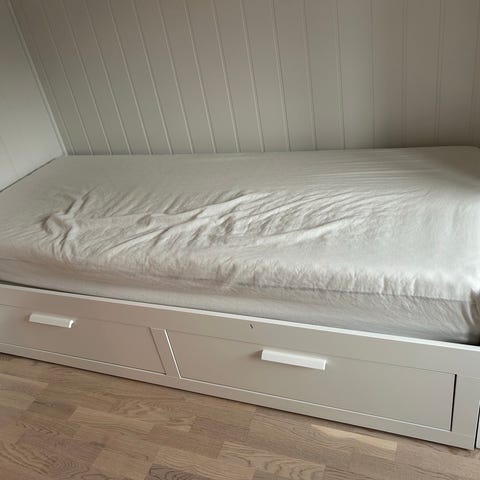 IKEA Brimnes 80(160)x200cm seng med skuffer under liggeflaten. Kan slås us til dobbeltseng. Sengen har integrerte oppbevaringsskuffer i underdelen, egnet for lagring av sengetøy, klær eller annet utstyr. Nøytral, lys farge som passer inn i de fleste soverom. Egnet for barnerom eller gjesterom.