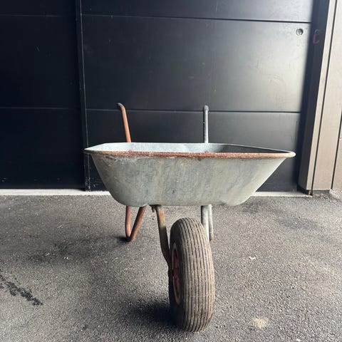 Trillebår i metall med grønn kasse. Er brukt til blomster så har dreneringshull , se bilder) hjulet er flatt- følger med nytt hjul Enkelt hjul foran (hjul avbildet i plastpose) og to håndtak med gripehylser. Kassen har noe slitasje og rustflekker innvendig. Egner seg til hagearbeid, transport av jord, planter og annet hageavfall.
