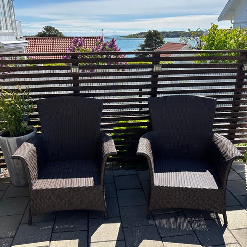 Hage-/balkongsett i kunstrotting og aluminium ramme bestående av to stoler og ett bord med glassplate. Møblene har grå rotting og rette ben på bordet. Settet er egnet for bruk på balkong, terrasse eller i hage som sittegruppe for to personer. Puter kan brukes i stolene for økt sittekomfort, puter følger med . Hel og fint