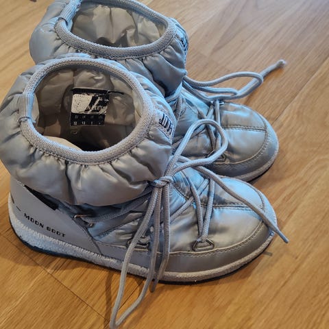 Moon Boot str 35 i rose gold. Modellen har høy skaft med snøring rundt ankelen og øverst på skaftet for bedre passform. Skoene er med vanntett nylon og lett vattert materiale som gir god isolasjon. Sålen er lys og kraftig med flat profil som gir stabilitet på glatt underlag. Egnet som vintersko/overgangssko til hverdagsbruk og utelek i kaldt vær.