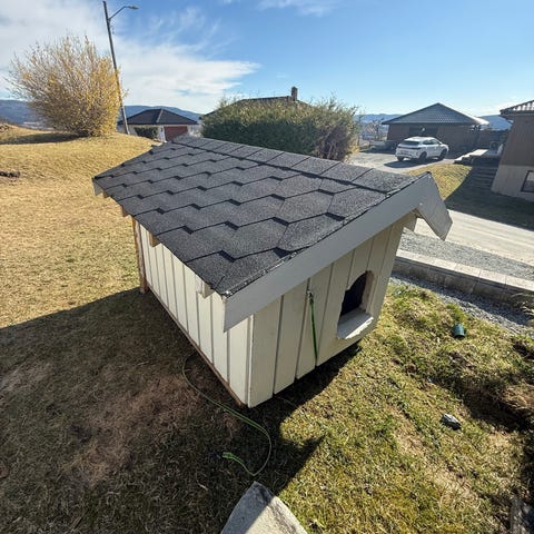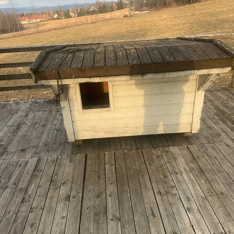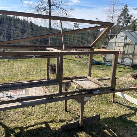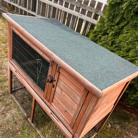 Kaninbur i tre for utendørs bruk, malt hvitt med mørkt tak. Buret har to øvre vinduer med netting og doble dører nede for enkel tilgang til innsiden. Egnet for kaniner eller andre smådyr, med plass til både hvile- og uteområde inne i buret. Plasseres på fast og tørt underlag, for eksempel grus eller platting, og kan eventuelt etterisoleres eller tilpasses etter behov.