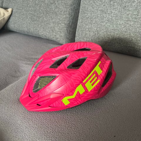 MET sykkelhjelm for barn i rosa og hvit farge med sommerfuglmotiv. Hjelmen har ventilasjonsåpninger for lufting og justering bak for bedre passform. Produsert i desember 2018 ifølge merking på innsiden. Egnet som sykkelhjelm til barn ved sykling og annen bruk der hodebeskyttelse er nødvendig.