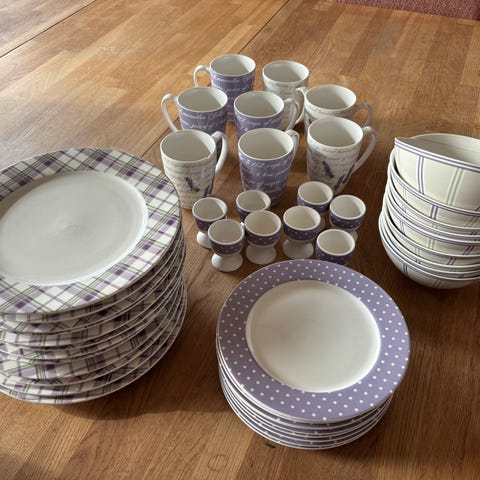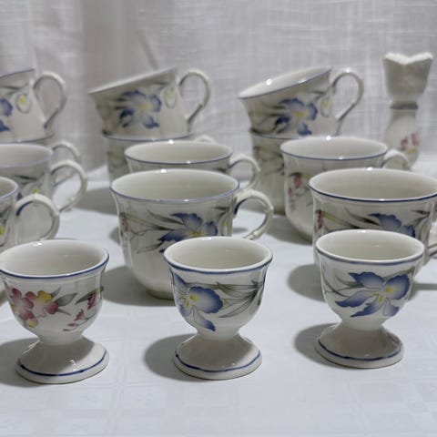 Villeroy & Boch Adeline servise i hvitt porselen med flerfarget blomsterdekor og blå kant. Serien tilhører House & Garden Collection.