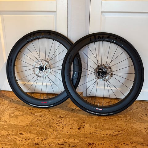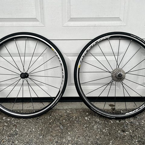 Nesten nytt hjulsett, kjøpt september 2025 og kun brukt på 5 korte turer ifjor. Mavic Ksyrium hjulsett med dekk, slanger, bremseskiver og kasset. Passer til landeveissykkel med skivebremser.