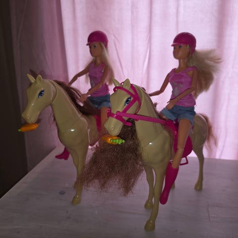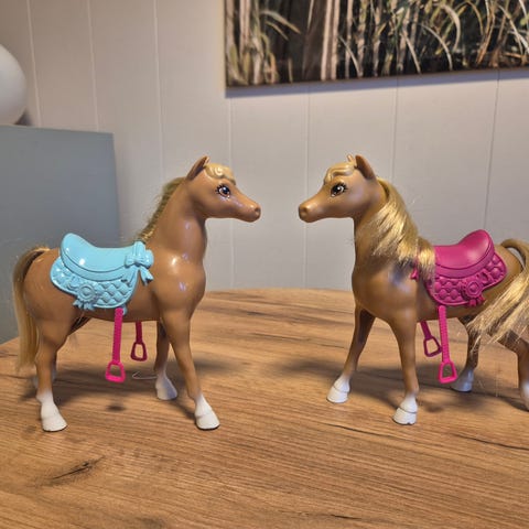 2 hester med hver sin sal, 1 grime på den ene + tilhørende dukke som manglet klær, så hun har fått på seg en tilfeldig kjole som er noe stor til henne men den sitter greit på.