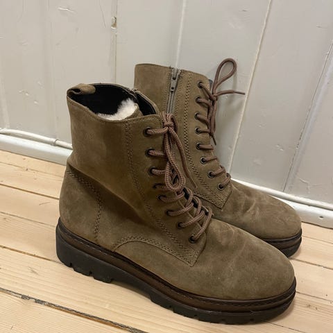 Vinterstøvler i skinn med saueskinn på innsiden. Skinn av ypperlig kvalitet, svært komfortable, knapt brukt. I utmerket stand.
