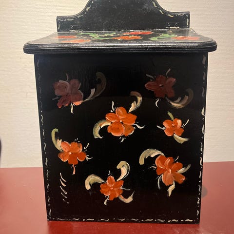 Håndmalt veggdekor i tre med tradisjonell rosemaling. Består av en vegghengt beholder og to runde fat/tallerkener med matchende motiv. Dekoren har florale mønstre i flere farger på naturfarget og mørk bakgrunn. Egnet som veggpynt i hytte, stue eller andre rom med tradisjonelt eller rustikt preg.