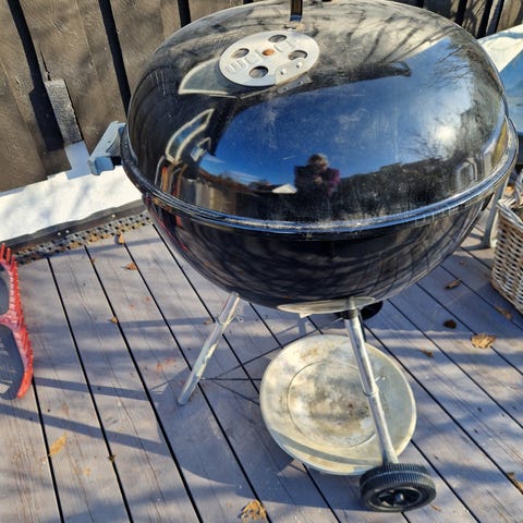 Kulegrill for kull i svart farge med lokk. Grillen har rund grillflate, lokk med luftventil og håndtak på toppen. Understellet består av tre ben, hvor to av bena har hjul for enkel forflytning. Det er også et rundt brett nederst mellom bena for oppsamling av aske eller oppbevaring av tilbehør. Egnet for grilling utendørs i hage, på terrasse eller lignende.