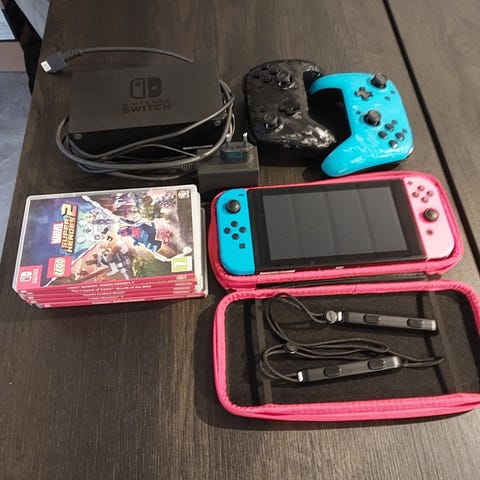 Nintendo Switch spillkonsoll med Joy-Con kontroller i blå/rød.
